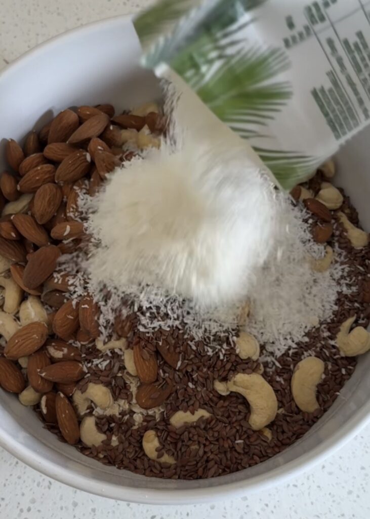 Dans un grand saladier, mélangez tous les ingrédients : graines de courges, de tournesols, de lin, les flocons d’avoine, les noix de cajou, les amandes et la noix de coco râpée.