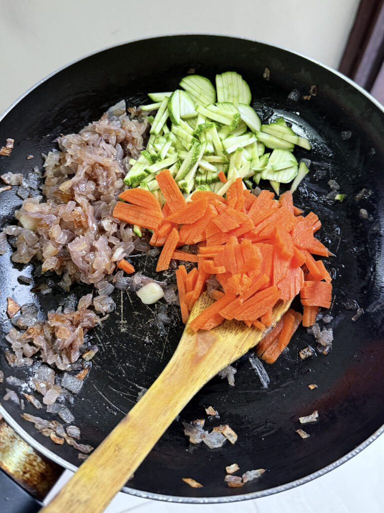 Ensuite, râpez la carotte et la courgette puis faites revenir le tout.