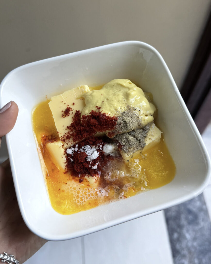 Dans un bol, mélangez le beurre mou, le jus de citron, le sel, le poivre, le gingembre, le curcuma, le paprika et la moutarde puis mélangez.
