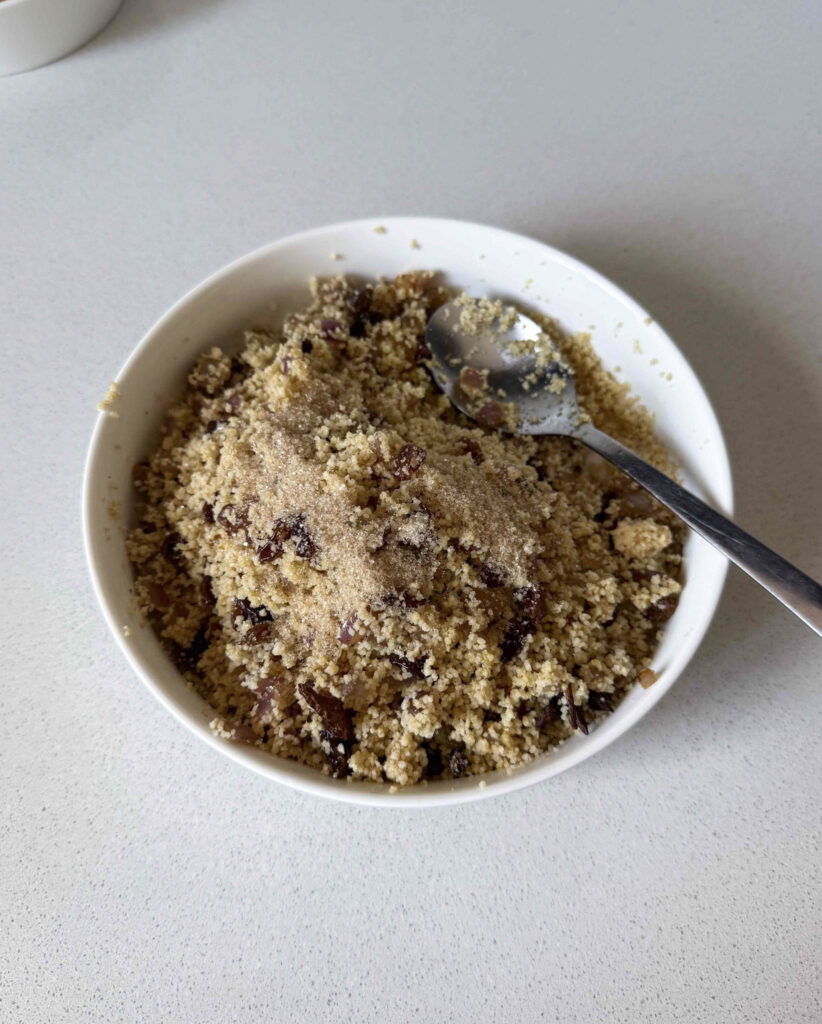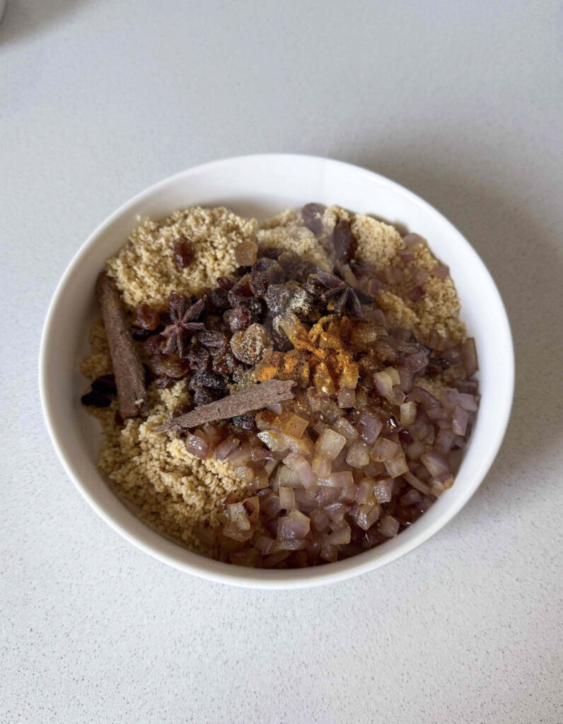 Dans un bol, versez la semoule de couscous cuite, l’oignon cuit, les raisins secs, les épices et mélangez.