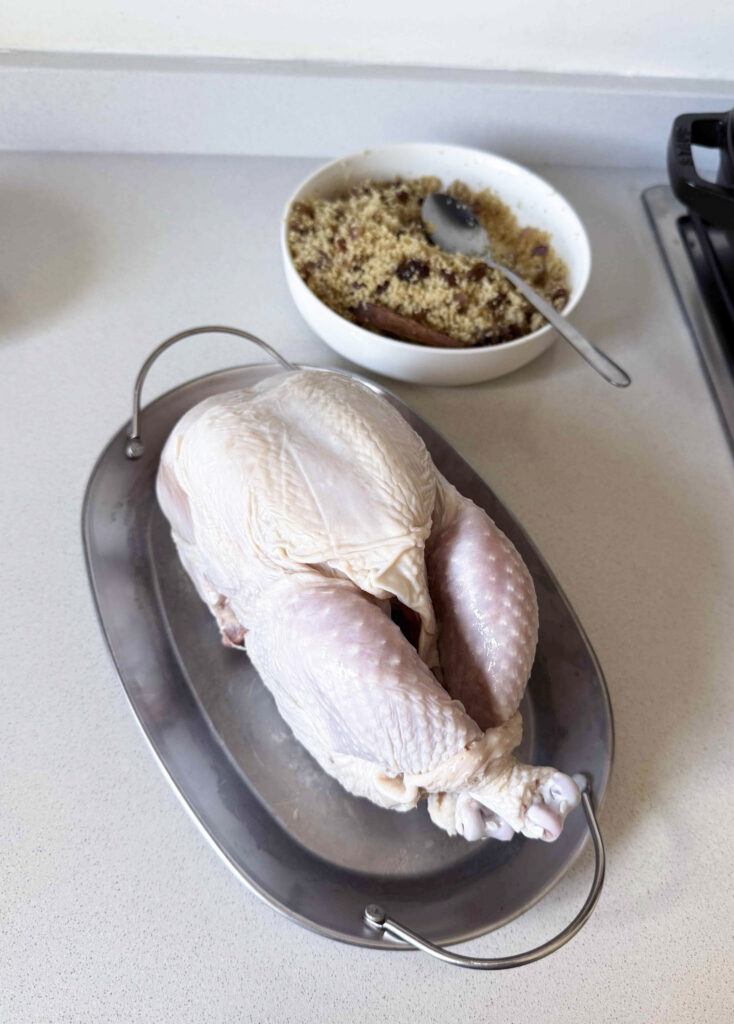 Remplissez votre poulet avec la farce puis bloquez les cuisses.