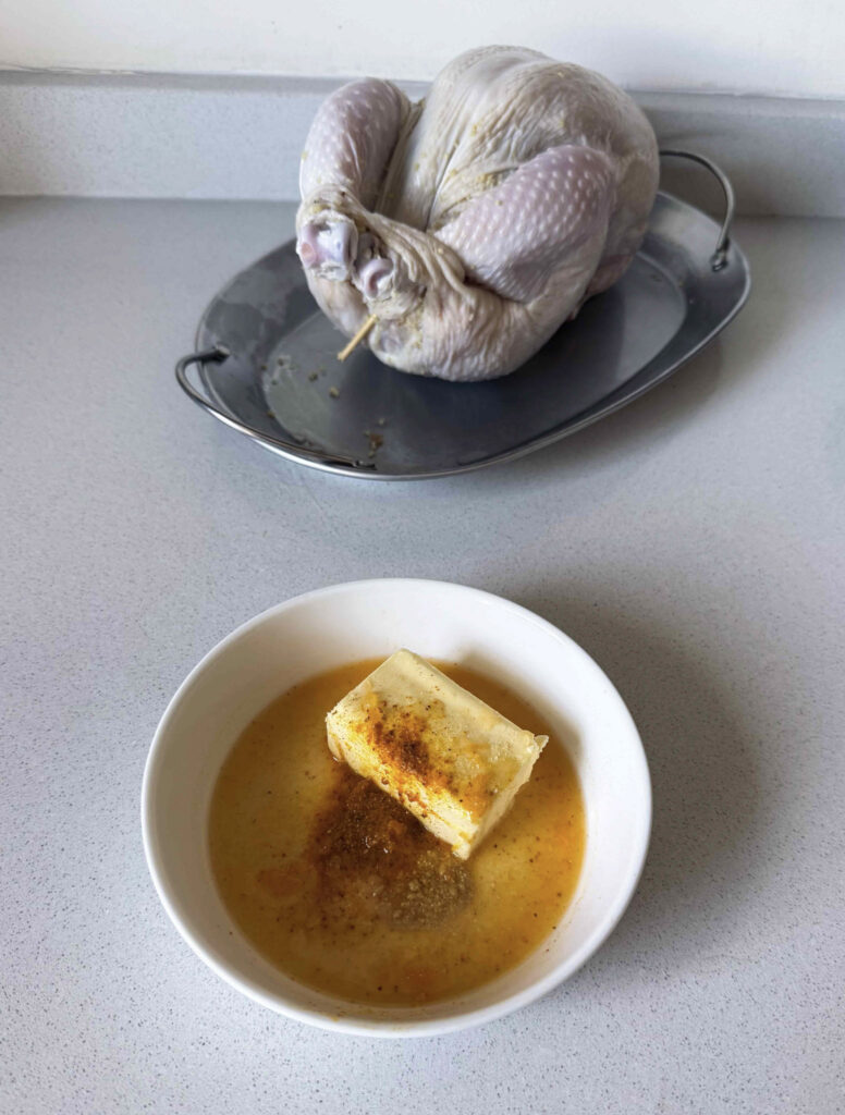 Commencez par préparer la farce. pour votre poulet rôti aux épices.