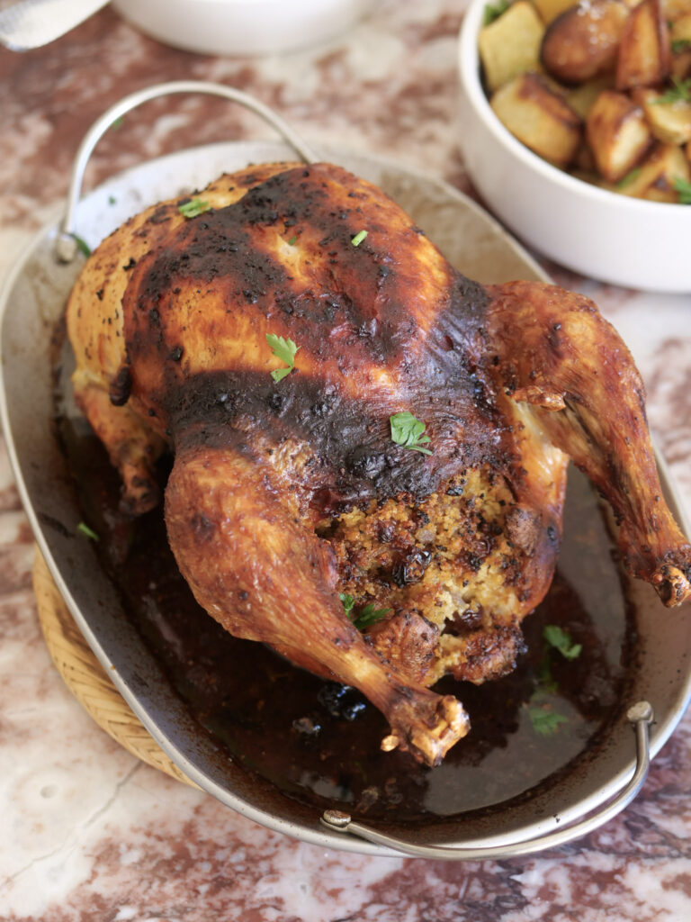 Poulet rôti aux épices farci au couscous et aux raisins secs