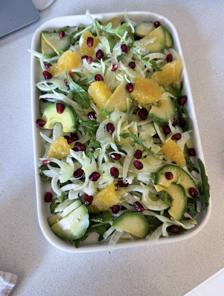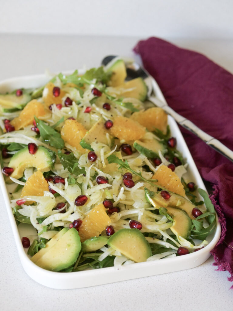 Aujourd’hui, je vous propose une salade de fenouil fraîche et vitaminée avec de la roquette, de la grenade, de l’orange et de l’avocat. C’est un mélange croquant et gourmand aux saveurs sucrées-salées, riche en vitamines, antioxydants et bonnes graisses.