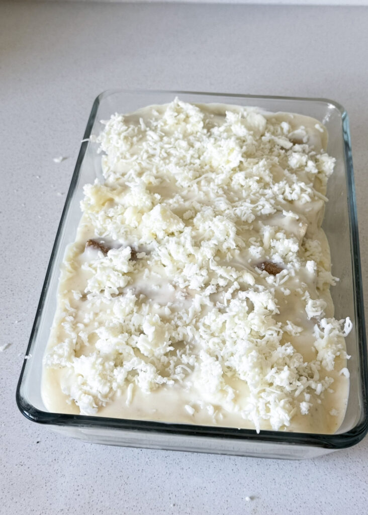 - Recouvrez-les de béchamel puis, ajoutez la mozzarella râpée par dessus.