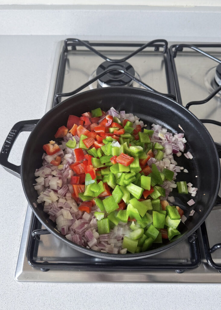 Dans une poêle, faites revenir l’oignon, la gousse d’ail et les poivrons hachés.