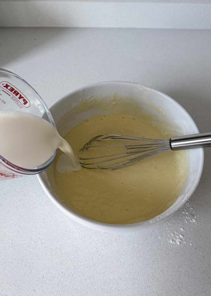 Pour cela, dans un saladier, versez la farine, les oeufs et le lait en mélangeant avec un fouet.
