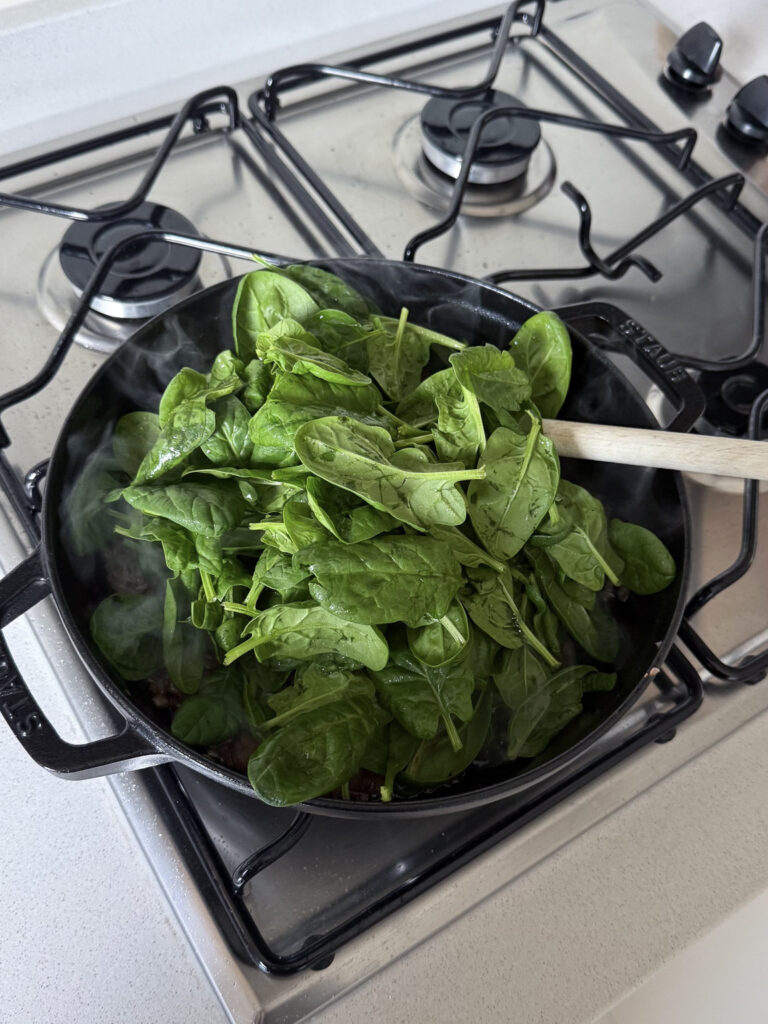 Ajoutez les pousses d’épinards et faites-les revenir jusqu’à ce qu’elles réduisent.