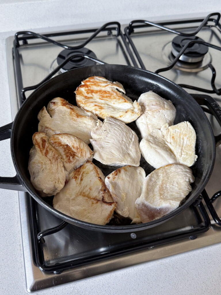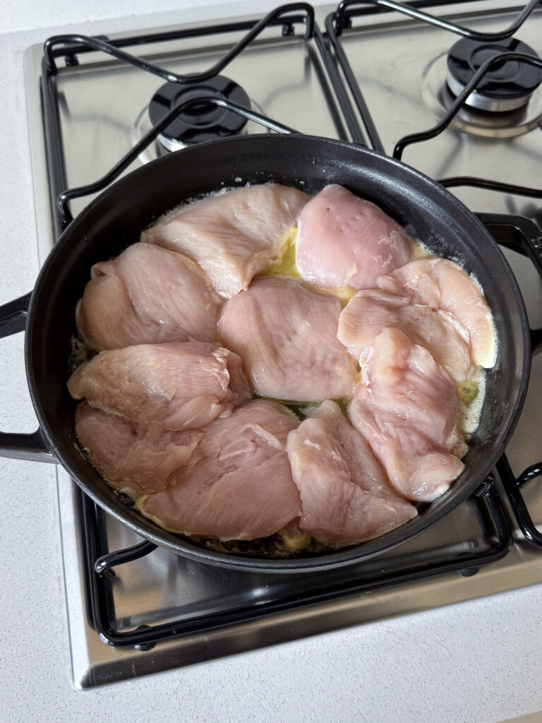 Une fois qu’elles sont cuites d’un côté, faites dorer les escalopes de poulet de l’autre.