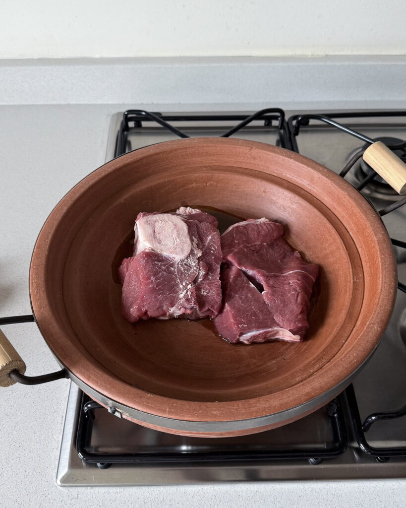 - Versez un filet d’huile d’olive dans votre tajine en terre cuite. Ajoutez-y les morceaux de veau et l’oignon haché.