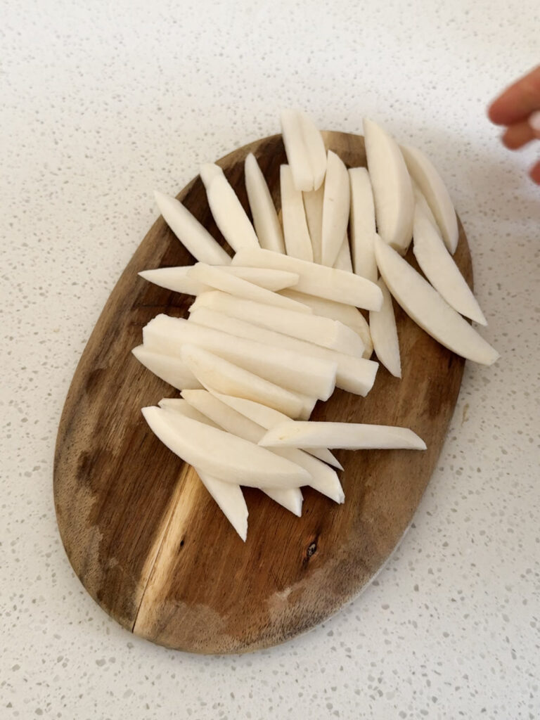 Épluchez le radis et coupez-le en bâtonnets.
