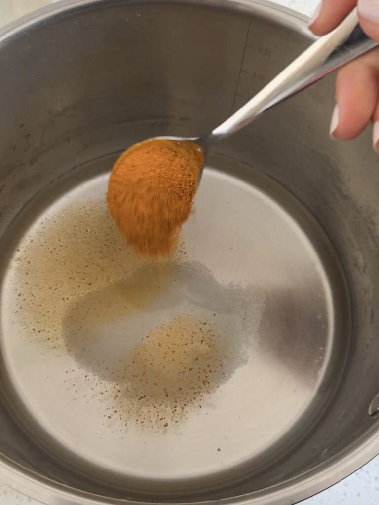 Dans une casserole, mélangez l’eau, le vinaigre, le sucre, le sel et le curcuma.