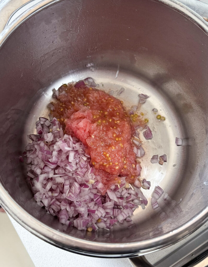 Dans une cocotte minute, versez l’oignon et l’ail coupé finement et la tomate râpée.