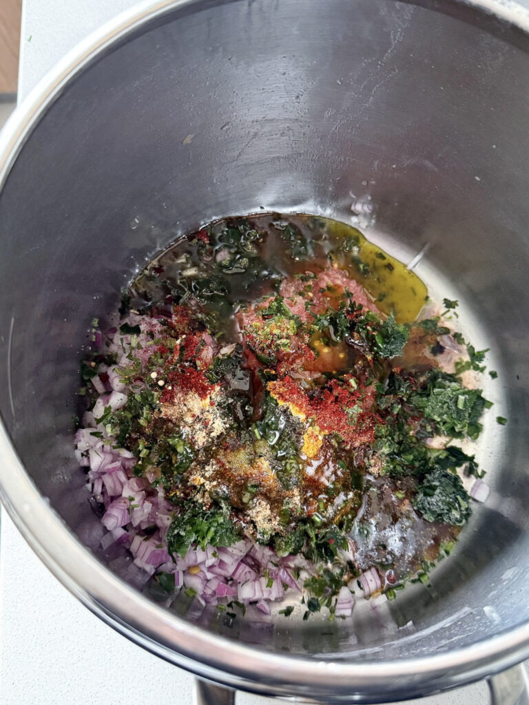 Ajoutez les épices, le persil et la coriandre hachés et l’huile d’olive.