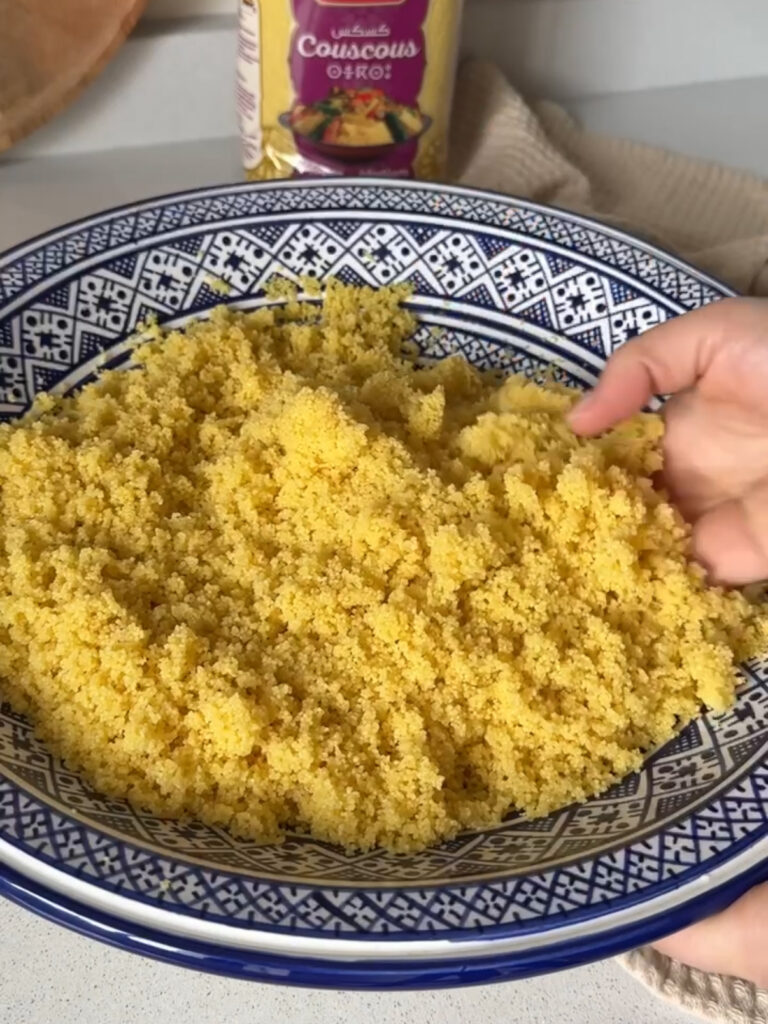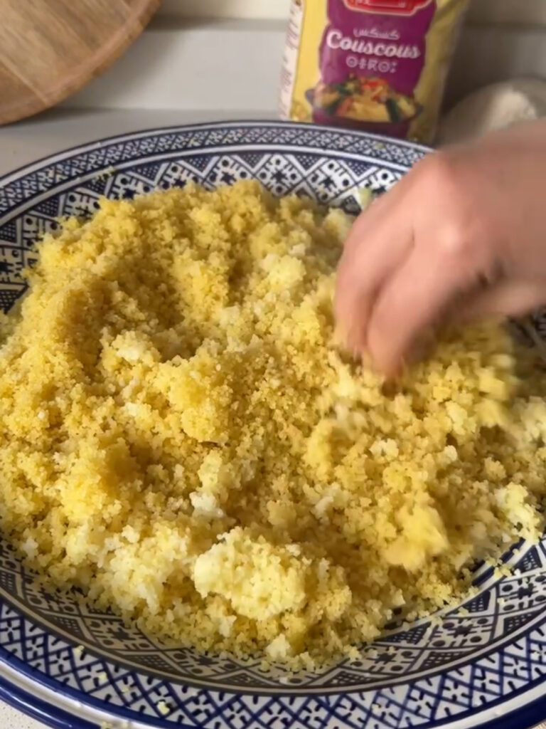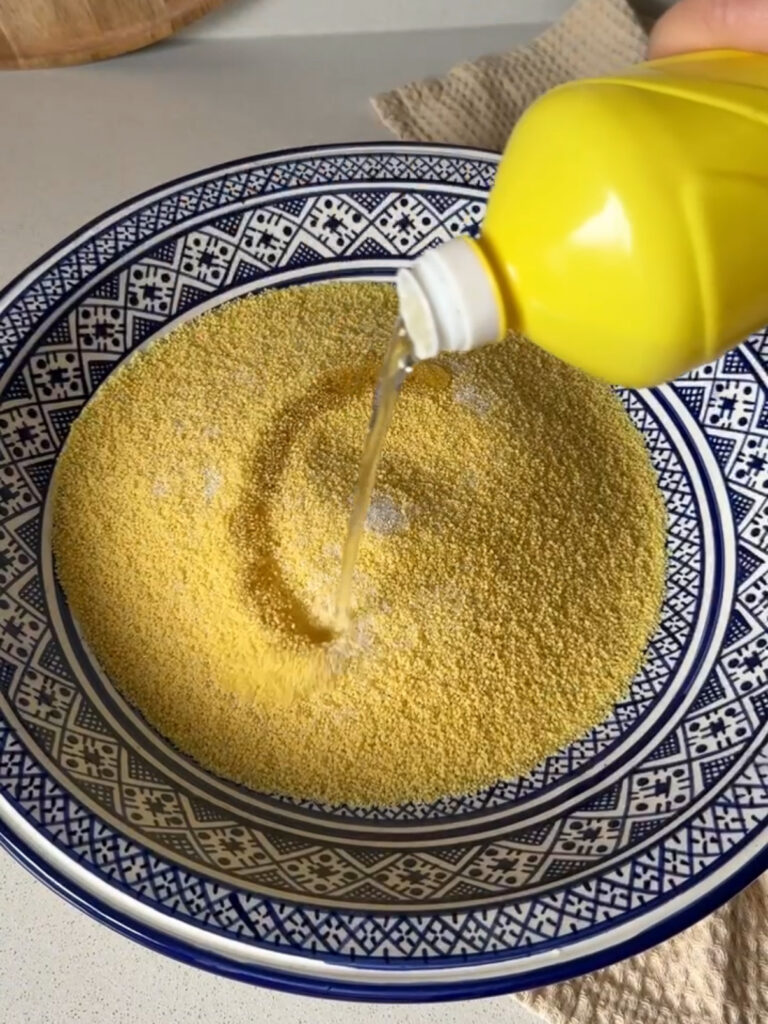 - Mélangez le couscous avec un filet d’huile de tournesol et une pincée de sel puis ajoutez un gros filet d’eau. Mélangez à nouveau puis laissez la semoule absorber.
