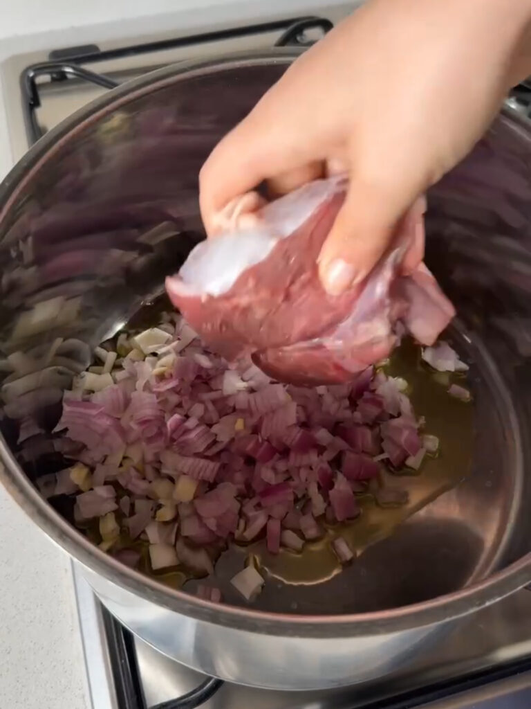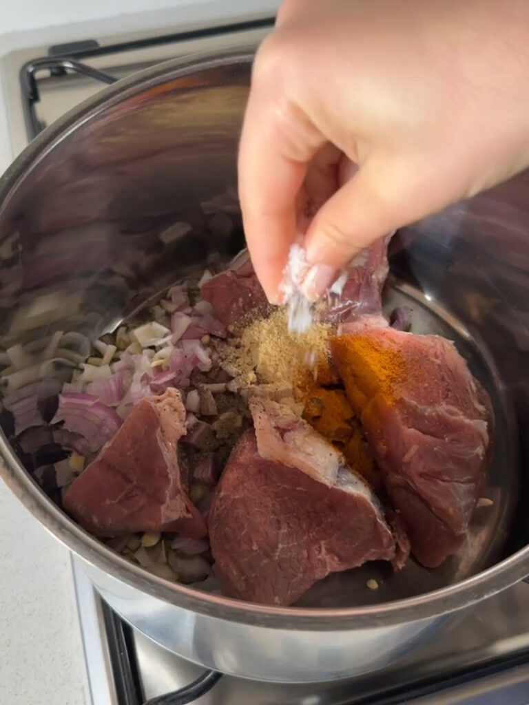 - Dans la marmite du couscoussier, faites revenir la viande avec l’huile d’olive, les oignons, les épices puis ajoutez la tomate râpée.Couvrez d’eau et laisser cuire à feux très doux.
