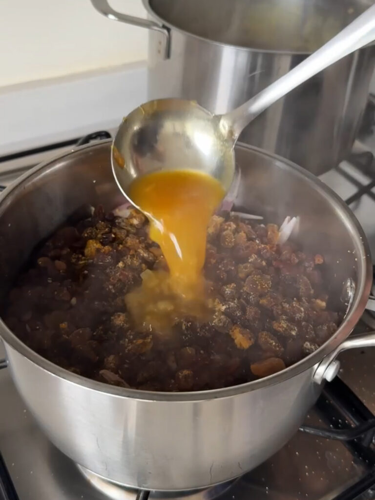 Lorsque la tfaya a réduit de moitié, ajoutez-y 3 louches de sauce (où il y a la viande) et mélangez.