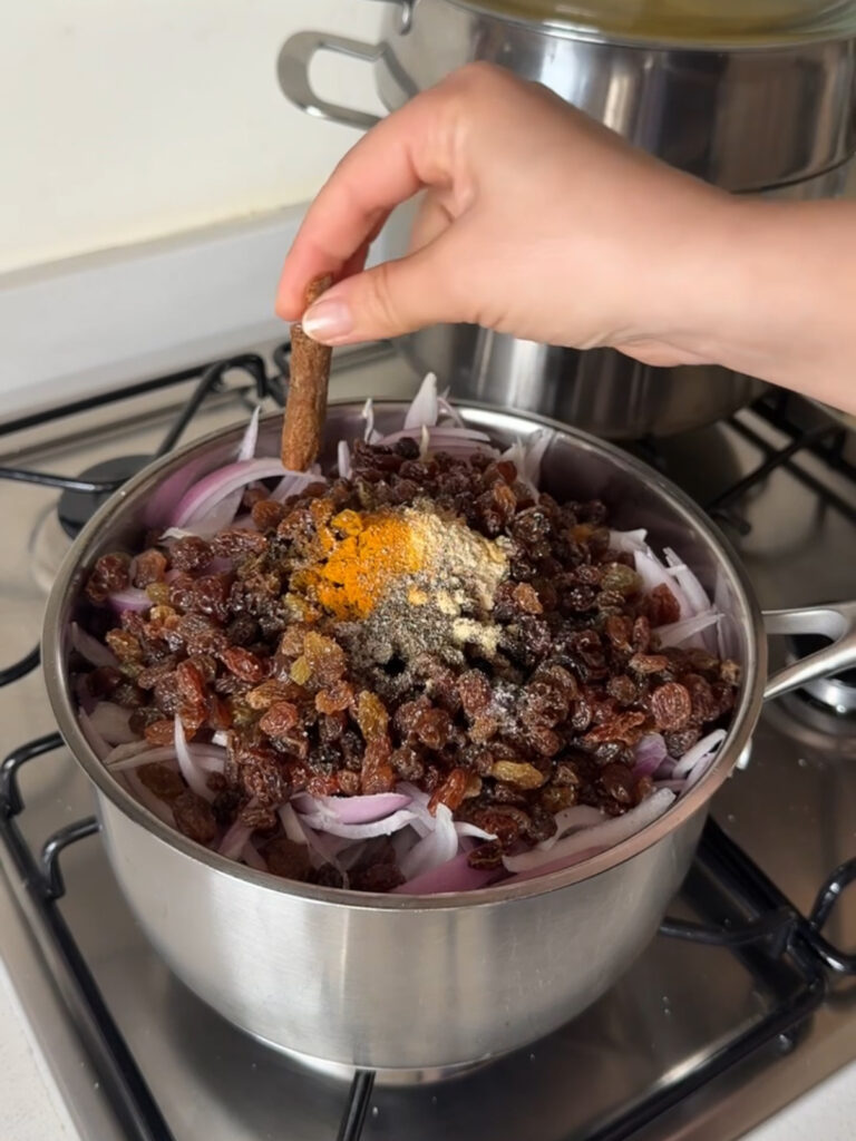 Dans une casserole, versez un filet d’huile d’olive et ajoutez par dessus les oignons émincés, les raisins secs, les épices, un verre d’eau et laissez confire à feu doux.